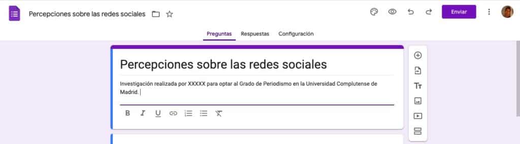 - Título: Para crear un formulario, primero debes darle un título. En este caso el nombre debería estar asociado con la investigación que estés realizando. Adicionalmente, puedes agregar una descripción en la que incluyas información clave sobre la investigación que estás realizando.