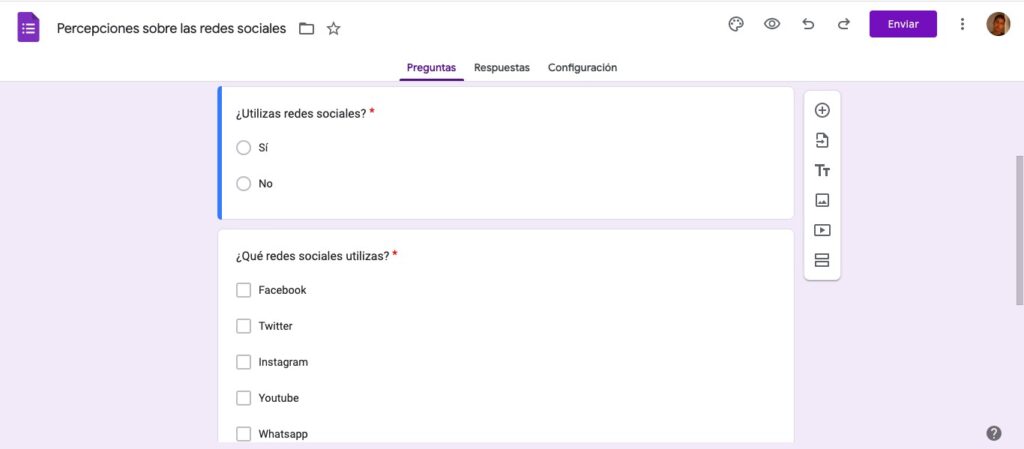 - Preguntas: A continuación, puedes agregar preguntas a tu formulario. Hay diferentes tipos, como preguntas de opción múltiple, de respuesta corta y de ensayo. También puedes agregar imágenes y videos a tu formulario. Todo esto definirá, como te comentamos, el tipo de resultados que esperes obtener.